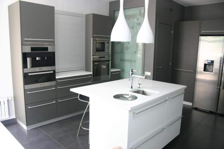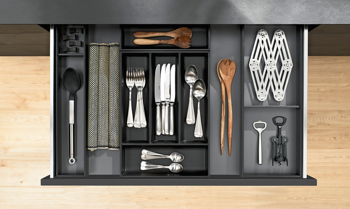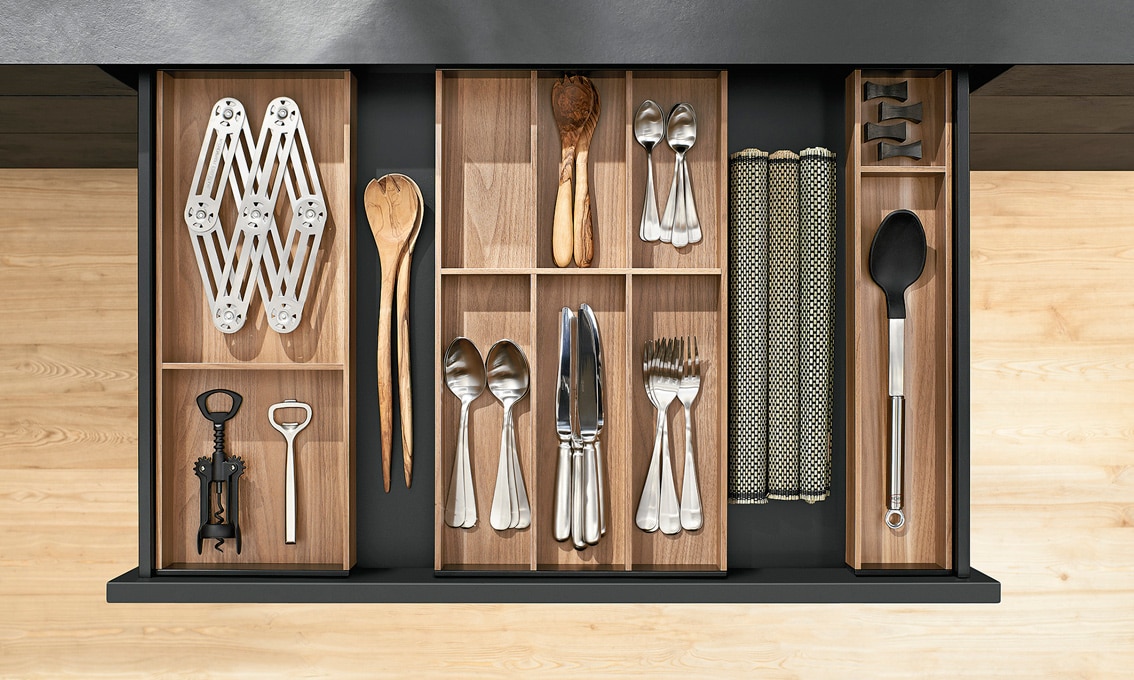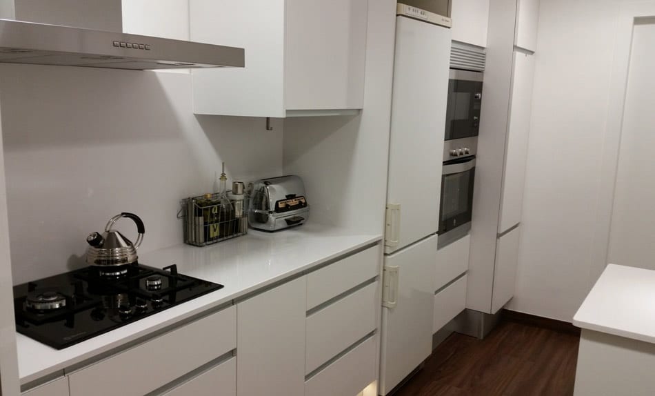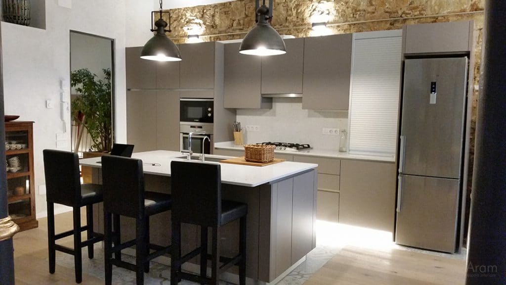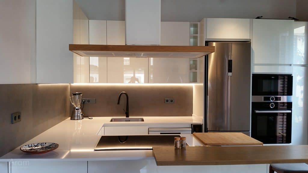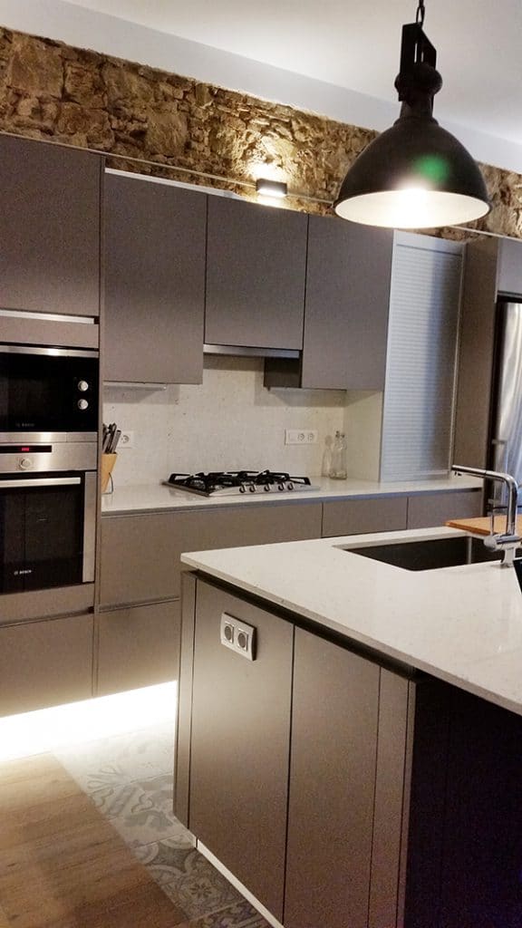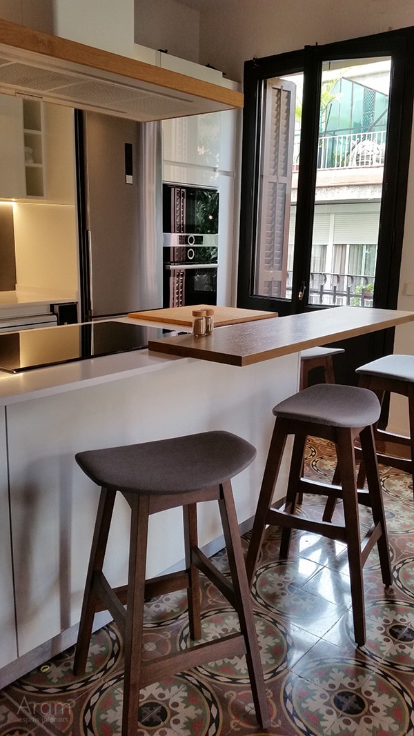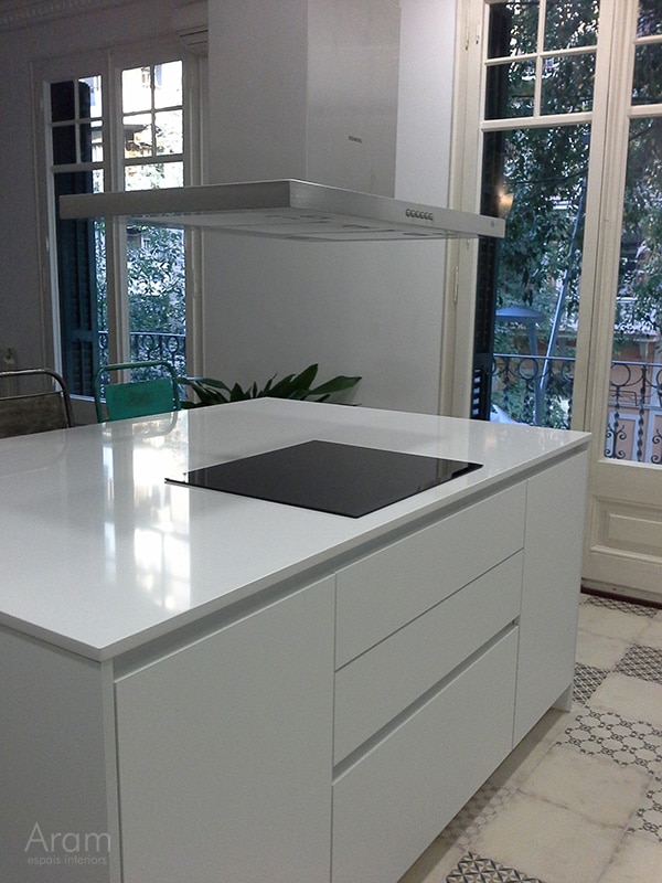 L'obertura de portes escamotejables ens permet deixar obert un armari columna a on hi posem el forn i el microones, la cafetera o qualsevol altre petit electrodomèstic així com calaixos interiors que no volem tenir a la vista.